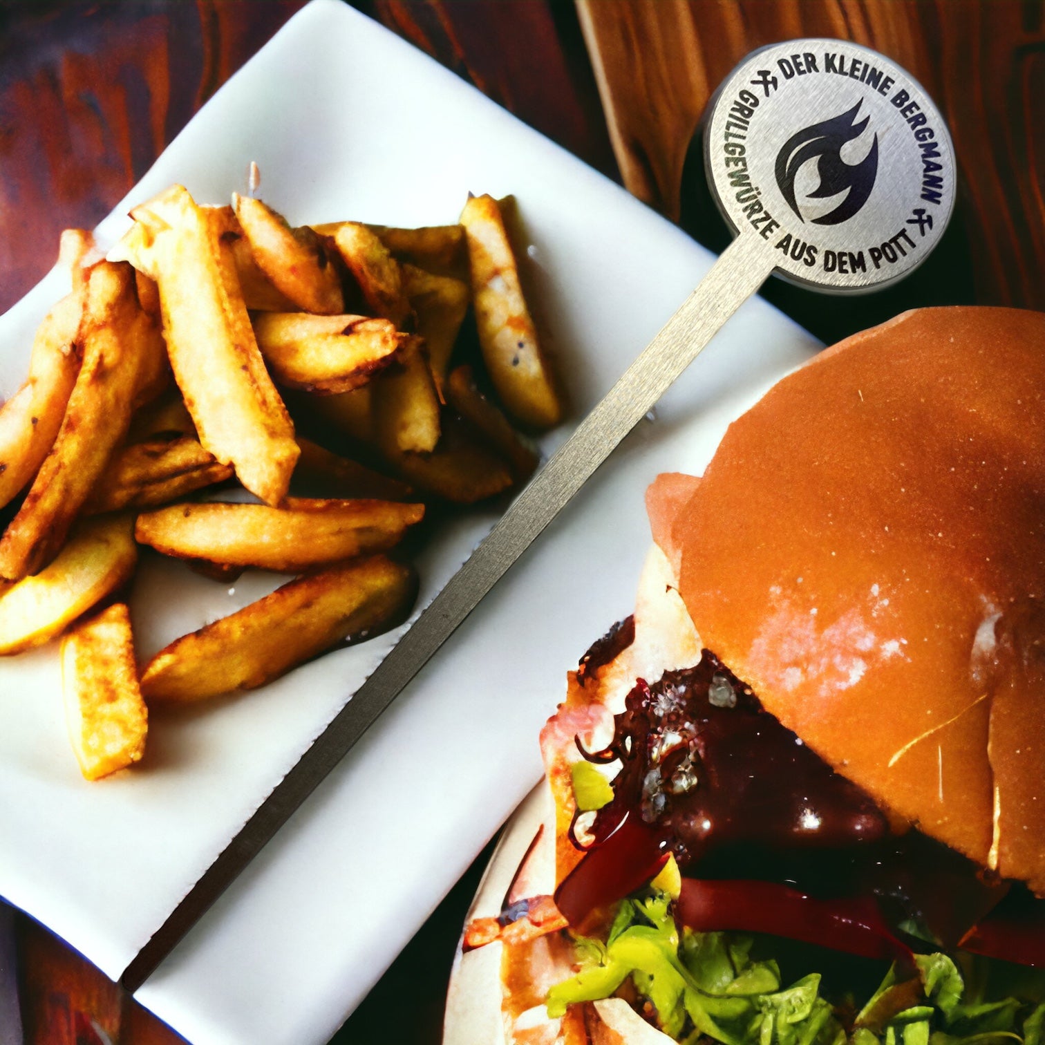 Diese Burger-Spieße aus Edelstahl sind der perfekte Begleiter in jeder Küche. Mit dem Logo von „Der Kleine Bergmann" verleihen sie jedem Burger einen einzigartigen Look. Ausgestattet mit einer hochwertigen Oberflächenbeschichtung sind die Spieße robust und langlebig.